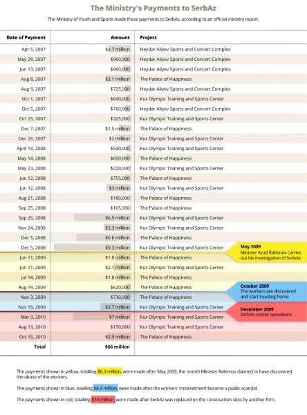 Gənclər və İdman Nazirliyi işçilərə qarşı amansız davranış faktları elan edildikdən sonra da "SerbAz"-a ödəniş etməyə davam edib, 2009-cu ilin noyabrında şirkətə 4,4 mln. dollar göndərib. Növbəti il nazirlik şirkətə əlavə olaraq 10 mln. dollar ödəyib.