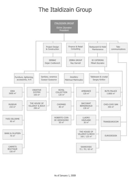 "İtalDizain" bu gün böyük holdinq-şirkətə çevrilib, buraya onlarla firma, o cümlədən telekommunikasiya, rieltor (alqı-satqı) firmaları, habelə "Cartier" -dən "Baccarat"-a qədər premium sinfi butiklər daxildir.