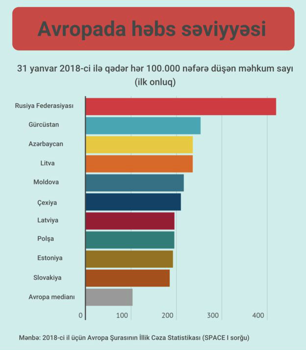 2017-ci ildə həbs cəzasının orta müddətinə görə Azərbaycan 37.7 ay nəticə ilə qurumun hesabatında birincidir.