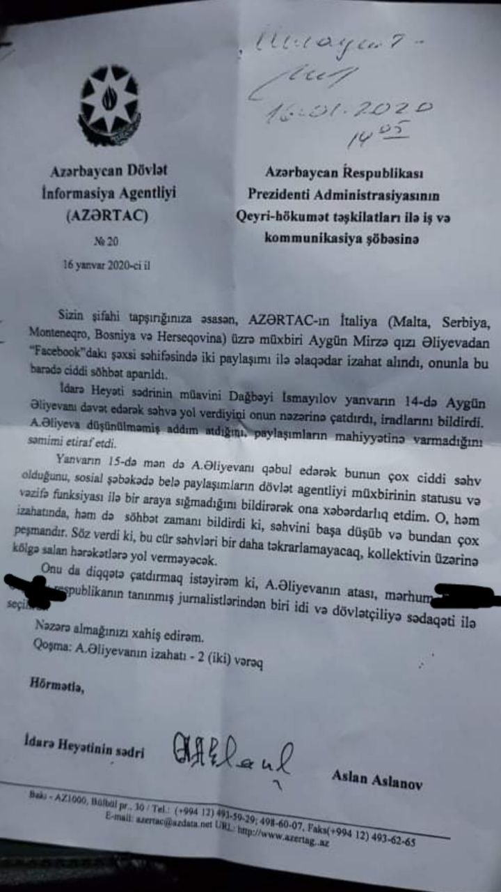 Əliyeva deyir ki, onun öz istəyilə işdən çıxmaq haqqında ərizə yazmasını istəyiblər: "Söhbəti dolandırıb dedilər ki, ərizə yaz. Niyəsini soruşduqda, bildirdilər ki, Dövlət Təhlükəsizlik Xidməti səni ittiham edir. Düzü, o zaman bir az çəkindim, nədə olsa, DTX-dan söhbət gedirdi. Amma ora zəng vurub bu barədə soruşanda bildirdilər ki, biz bu adamla maraqlanmırıq, maraqlanmaq üçün səbəb də yoxdur. Sonrakı dəfə agentlik Prezident Administrasiyasından Vüqar Əliyevin adını çəkib bildirdi ki, ərizə yazmağımı o istəyib. İmtina etdim deyə, işimi yerinə yetirməmək bəhanəsiylə işdən çıxardılar”.
