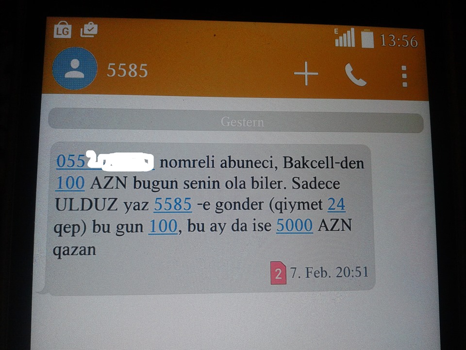 "055 *** ** ** nömrəli abunəçi, Bakcell dən 100 AZN bu gün sənin ola bilər. Sadəcə ULDUZ yaz 5585-ə göndər (qiymət 24 qəpik). Bu gün 100 AZN, bu ayda isə 5000 AZN qazan", - deyə abonentlərə göndərilən smslərdə deyilir.