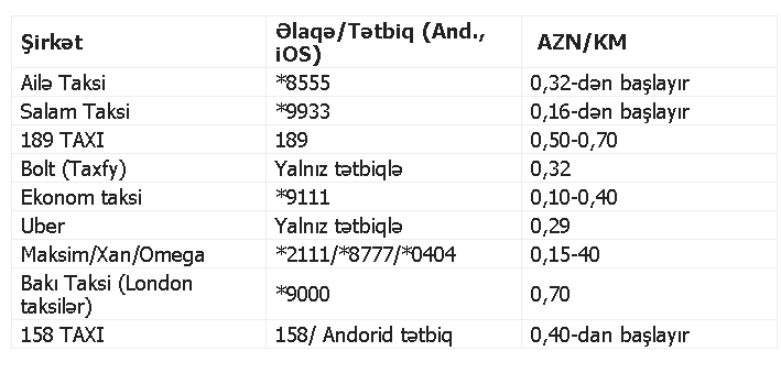 Araşdırma zamanı məlum olur ki, ölkədə ən aşağı taksi xidmət təklif edənlər "Maksim” (*2111), "Omega” (*0404), "Xan Taksi” (*8777) kimi taksilərdir bir platformadan fəaliyyət göstərir ki, sürücüyə göndərdiyi hər müştəridən 15-20% arasında komissiya haqqı tuturlar.