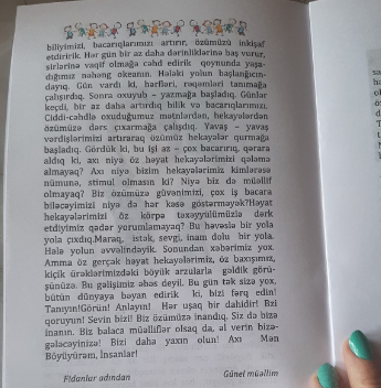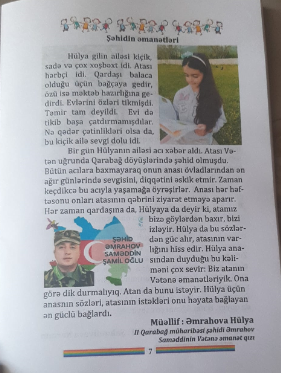 20 tirajla nəşr edilən kitabça şagirdlərin vətənpərvərlik və digər mövzularda qələmə aldığı hekayələrdən ibarətdir.