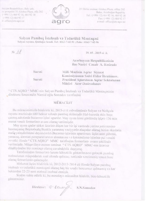 Salyan pambıq istehsalı və tədarükü məntəqəsinin rəhbərliyi problemin həllində onlara yardım göstərilməsi xahişi ilə mayın 29-da baş nazir Artur Rəsizadəyə, Milli Məclisin Aqrar Siyasət Komitəsinin sədri Eldar İbrahimova və Prezident Administrasiyası aqrar sektoruna məktubla müraciət edib.