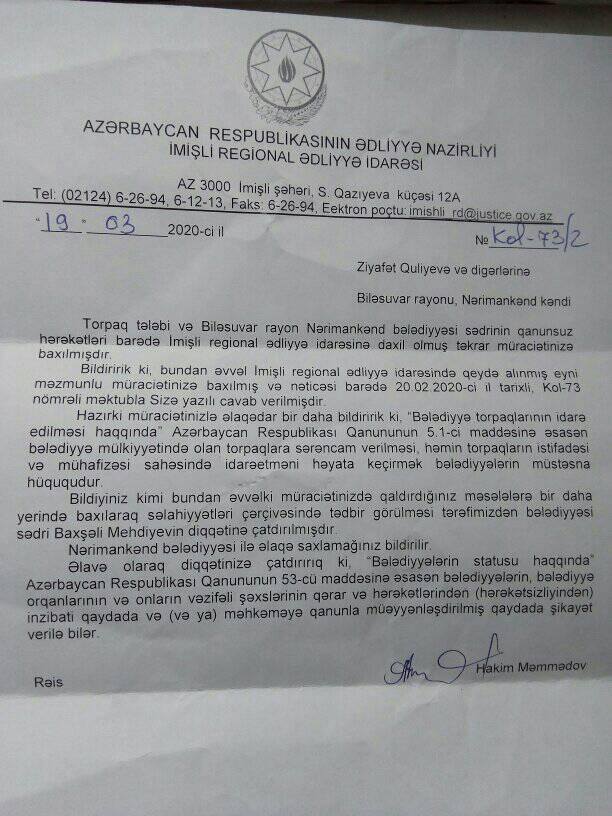 "İmişli Regional Ədliyyə İdarəsinə sözügedən problemlə əlaqədar müraciət etdim, cavab yazdılar, amma gəlib yerində inzibatı nəzarət icratı qaydasında problemləri araşdırmadılar. Şikayətimdə bələdiyyə sədrinin qanunsuz əməlləri və cinayətlərindən də bəhs etmişdim, amma baxan olmadı".