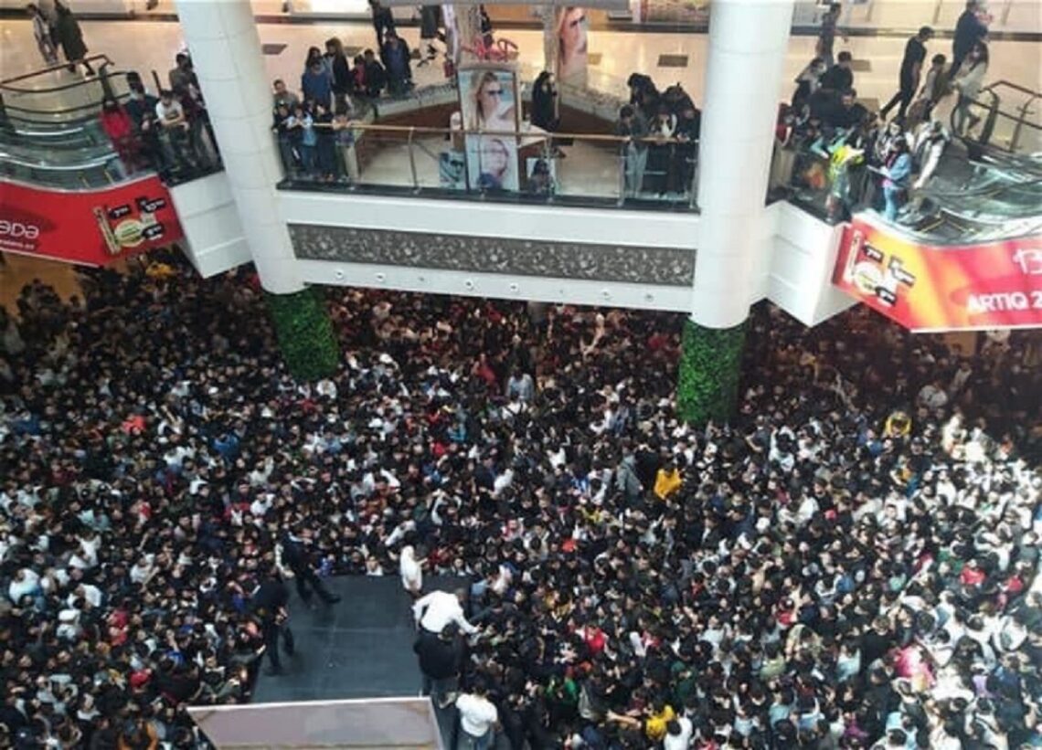Sosial şəbəkələrdə yayılan görüntülərdən məlum olur ki, minlərlə insan blogeri görmək üçün mərkəzə axın edib.
