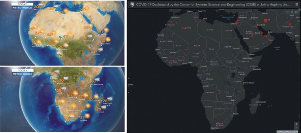 Con Hopkins Universitetinin dünya koronavirus pandemiyası xəritəsinin və Euronews-un 12 aprel 2020-ci il yer üzündə hava xəritəsinin müqayisəsi
