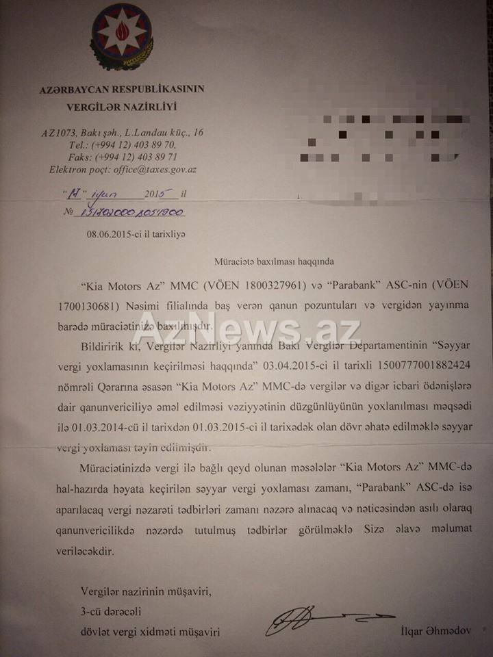 Bu arada Vergilər Nazirliyinin həqiqətən də "Parabank” və "Kia Motors” MMC-də yoxlamalar apardığını əks etdirən sənəd eldə etmişik. Bu sənəd hər iki qurumdan şikayət edən vətəndaşa göndərilən rəsmi cavabdır. Göründüyü kimi məktubda hər iki qurumda uzun müddətli yoxlamalara başlanıldığı qeyd olunur.