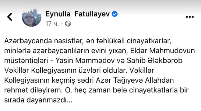 "Azərbaycanda nasistlər, ən təhlükəli cinayətkarlar, minlərlə azərbaycanlının evini yıxan, Eldar Mahmudovun müstəntiqləri - Yasin Məmmədov və Sahib Ələkbərov Vəkillər Kollegiyasının üzvləri oldular. Vəkillər Kollegiyasının keçmiş sədri Azər Tağıyevə Allahdan rəhmət diləyirəm. O, heç zaman belə cinayətkatlarla bir sırada dayanmazdı", - deyə Fətullayev Kollegiyanın sədri Anar Bağırovu hədəfə alıb.