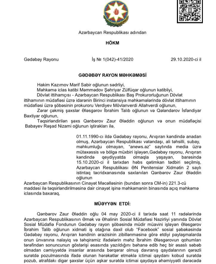 "Anews.az” saytının bölgə müxbiri Zaur Qəmbərov yaşadığı Gədəbəy rayonunda Dövlət Sosial Müdafiə Fondunun yerli şöbəsinin müdir müavini və sürücüsünə qarşı xuliqanlıq ittihamıyla 3 il 6 ay azadlıqdan məhrum edilib. Amma özü də, ailə üzvləri də deyir ki, xuliqanlıq ittihamı saxtadır, həbsin əsl səbəbi rayonda baş verən qanunsuzluqlarla bağlı faktları işıqlandırmasıdır.