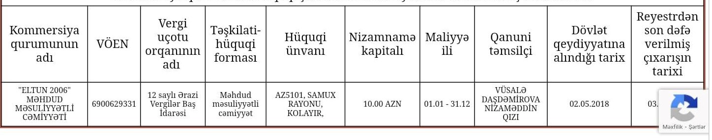 Şirkətin hüquqi ünvanı Samux rayonu, Kolayır kəndi, qanuni təmsilçisi isə altı gün öncə Gəncə Gənclər Evinin sifarişçi olduğu digər satınalmasında fiziki şəxs qismində qalib elan edilən Daşdəmirova Vüsalə Nizaməddin qızıdır.