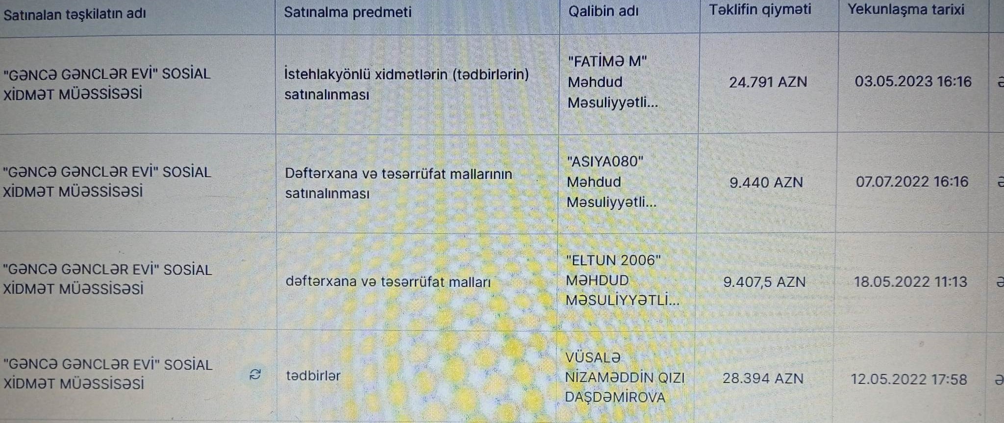 Fəaliyyət profilləri barədə heç bir məlumat olmayan, qanuni təmsilçilərini qohumluq əlaqələri birləşdirən MMC-lərin hansı meyarlara əsasən 2 il ardıcıl olaraq Gəncə Gənclər Evinin sifarişçi olduğu satınalmalarda qalib elan edilmələri ortaya bir sıra suallar çıxarır.