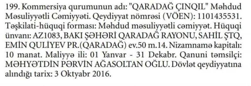 Jurnalist yazıb ki, icra başçısına qeyri-rəsmi aid olan Qaradağ çınqıl karxanası rəsmi olaraq rayon sakini, Sahil qəsəbəsj, Emin Quliyev pr, ev 50, m. 14 ünvanında qeydiyyatda olan Pərvin Məhyətdin Ağasoltan oğlunun adına rəsmiləşdirilib: "Karxana "Qaradağ çınqıl” Məhdud Məsuliyyətli Cəmiyyəti adı ilə 2016-cı ildə 1101435531 saylı VÖEN nömrəsi ilə qeydiyyatdan keçib. Məsələnin daha maraqlı tərəfi, "Qaradağ çınqıl” MMC-nin rəsmi sahibi Pərvin Məhyətdin Ağasoltan oğlunun adına 2018-ci ilin noyabrın 1-dən 2020-ci ilin noyabrın 1-dək ünvanlı sosial yardım təyin olunub”.