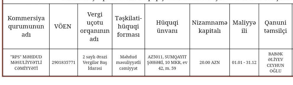 "RPS" MMC 2009-cu ildə qeydiyyata alınıb. Bu MMC-nin qanuni təmsilçisi Əliyev Babək Ceyhun oğlu, hüquqi ünvanı isə Kollecin digər satınalmasında qalib edilən "DİSCOVERY AA" MMC ilə eyni hüquqi üvandadır: Sumqayıt şəhəri, 10-cu MKR, ev 42 mənzil 59.