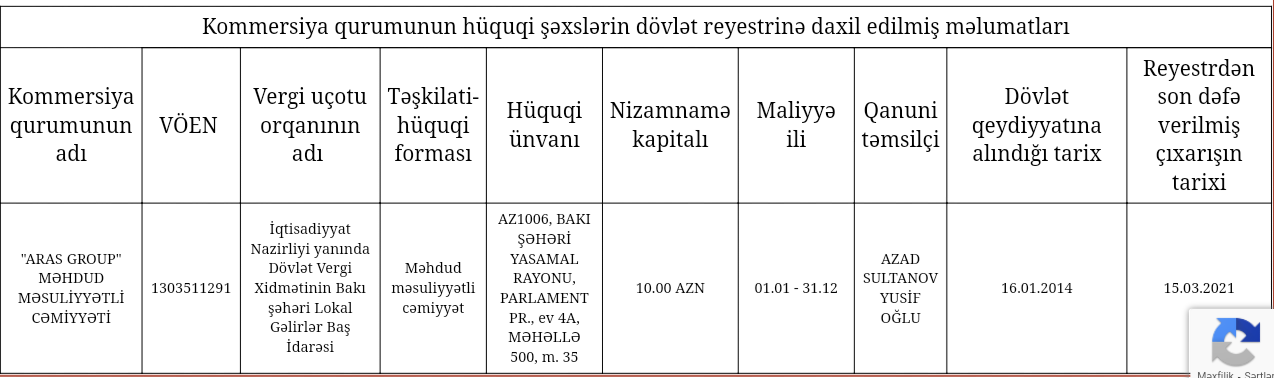 "Aras Group" MMC 2014-cü ilin yanvar ayında dövlət reyestrində qeydiyyata alınıb. Şirkətin nizamnamə kapitalı 10 manat, qanuni təmsilçisi isə Sultanov Azad Yusif oğludur.