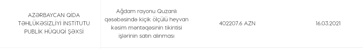 Bildirilir ki, institut ilə MMC arasında mart ayının 16-da yekun vurulmuş "Ağdam rayonu Quzanlı qəsəbəsində kiçik ölçülü heyvan kəsim məntəqəsinin tikintisi işlərinin satın alınması" lotu üzrə tenderin məbləği 402.207 manat təşkil edib.