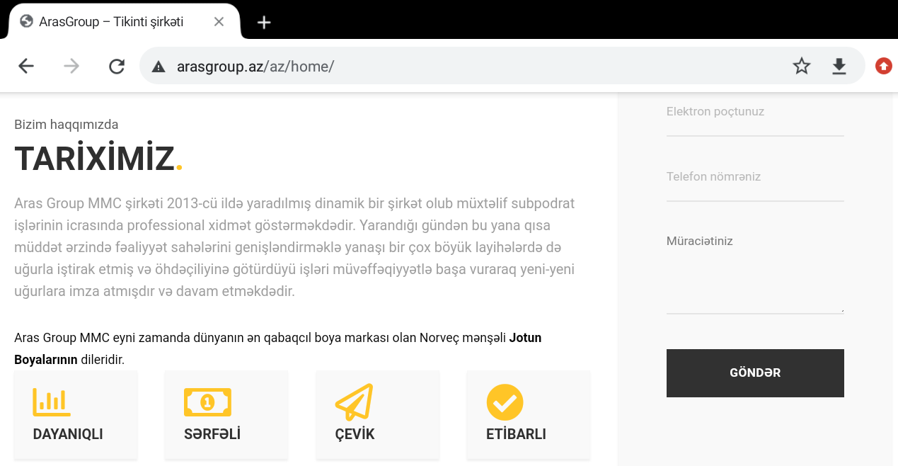 Şirkət arasgroup.az domenli websaytda özü haqqında müxtəlif məlumatlar verir. Məsələn, şirkət "xidmətlər" bölümündə hidrolizasiya, epoksid, qumlama-boyama, linoleum, beton işləri və boya tətbiqi sahələri üzrə xidmət göstərdiyini elan edir. Gördüyümüz kimi burada xüsusi lisenziya tələb olunan qaynaq işləri və digər tikinti işləri aparması barədə şirkət heç bir məlumat vermir.