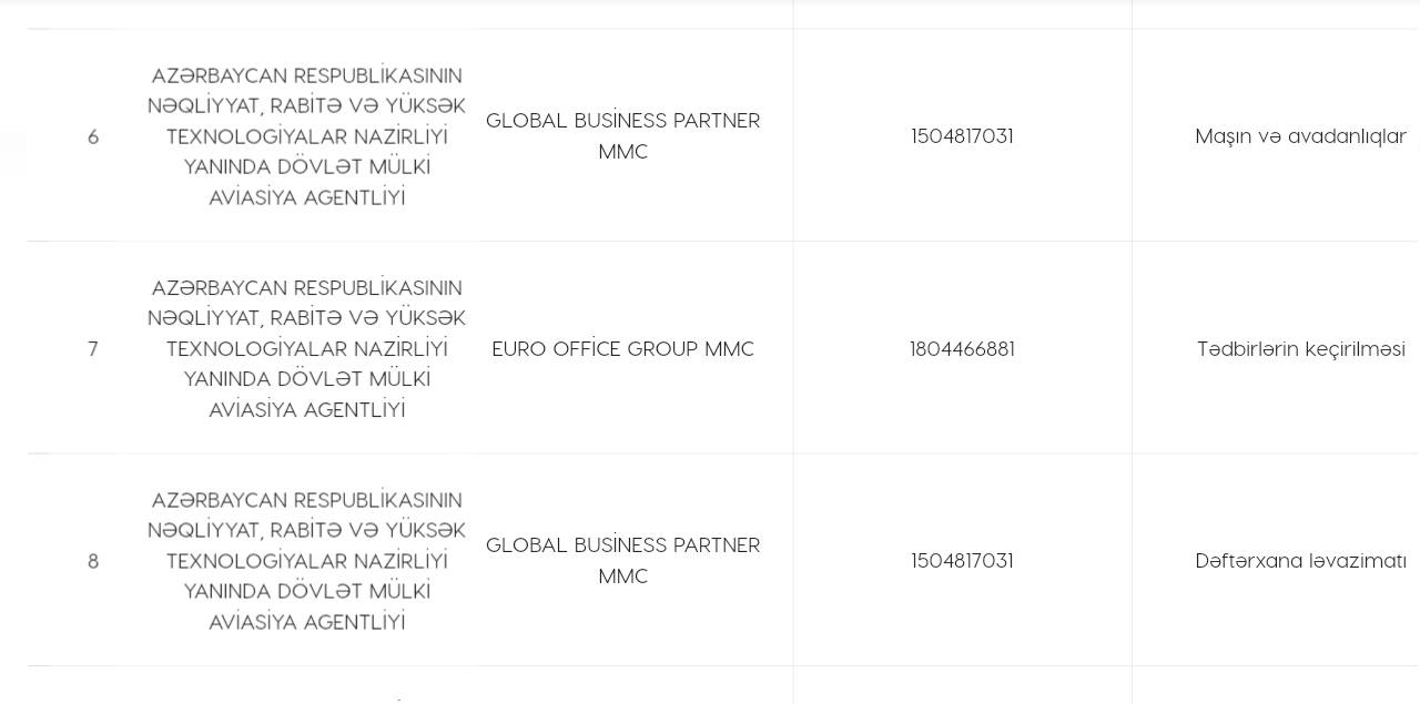 Dövlət Mülki Aviasiya Agentliyinin 2020-ci ilin fevral ayının 18-də "Maşın və avadanlıqlar" lotu (dəyəri 10.335) üzrə yekun vurduğu satınalmanın qalibi "GLOBAL BUSİNESS PARTNER" Məhdud Məsuliyyətli Cəmiyyəti (MMC) olub.