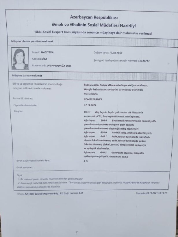 Tibbi-Sosial Ekspert Komissiyasında sonuncu müayinəyə dair məlumatı.