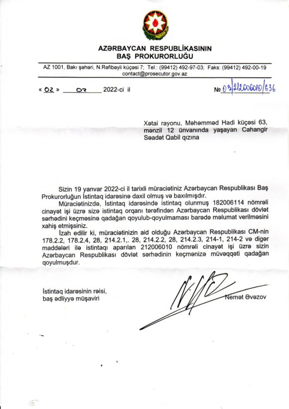 S.Cahangir yanvarın 19-da Baş Prokurorluğa məktub yazıb və ölkədən çıxışının qadağan olub-olmadığı barədə məlumat istəyib: