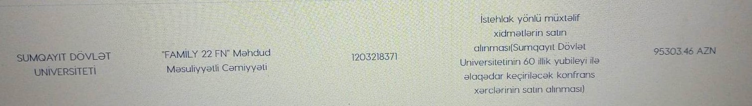 Sumqayıt Dövlət Universiteti "Sumqayıt Dövlət Universitetinin 60 illik yubileyi ilə əlaqədar keçiriləcək konfrans xərclərinin satın alınması" lotu üzrə 2022-ci ilin noyabr ayının 22-də yekun vurduğu 95.303 manat dəyəri olan tenderdə qalib elan edilən "FAMİLY 22 FN" MMC tenderdən bir ay əvvəl 2022-ci ilin oktyabr ayının 4-də dövlət qeydiyyatından keçib.