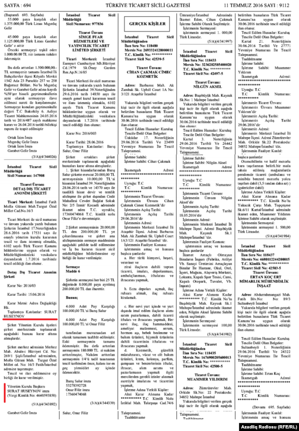 Türkiyədə kommersiya şirkətləri reyestrində yer alan məlumatlar əsasən Surət Hüseynov bu ölkədə neft biznesi ilə məşğuldur.