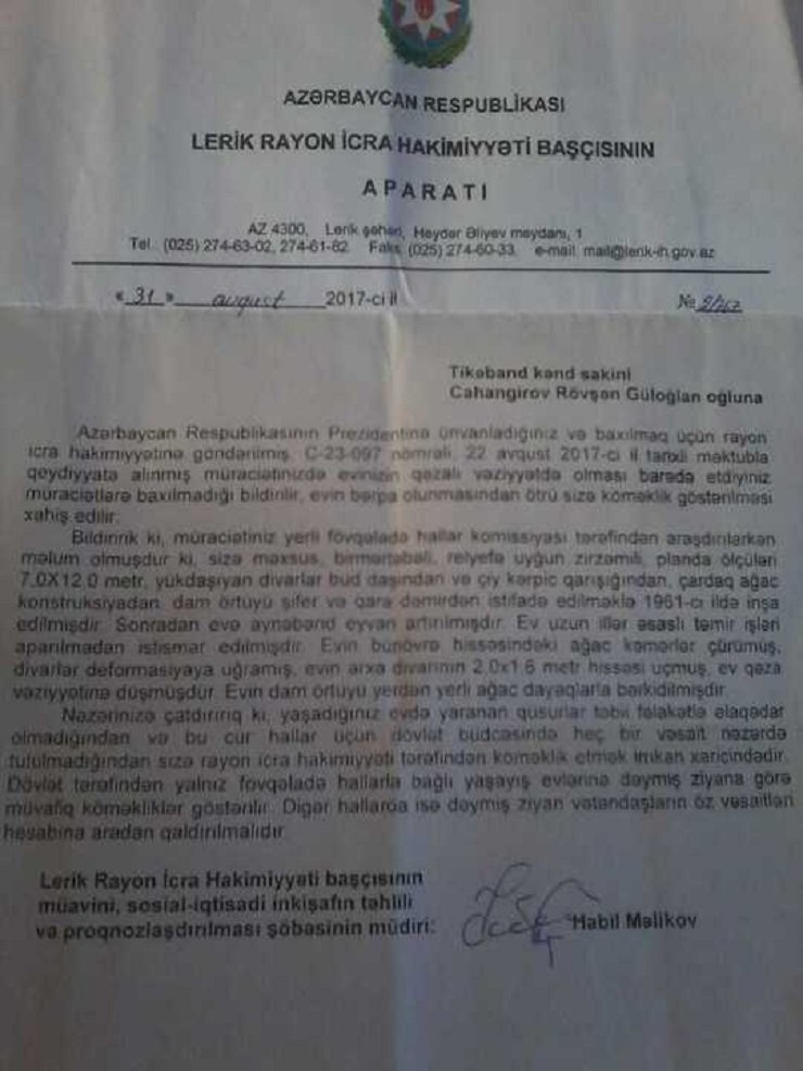 Lerik Rayon İcra Hakimiyyətindən Meydan TV-yə bildirilib ki, ailə üzvü Nazilə Dədəcanova evin qəzalı olması səbəbindən yeni evin tikilməsi üçün həm bu, həm də başqa qurumlara müraciət edib. Xanıma bildirilib ki, icra hakimiyyəti qəzanı aradan qaldıran, ev tikən qurum deyil. Ailəyə aidiyyəti üzrə Fövqəladə Hallar Nazirliyinə müraciət etmək tövsiyə olunub.