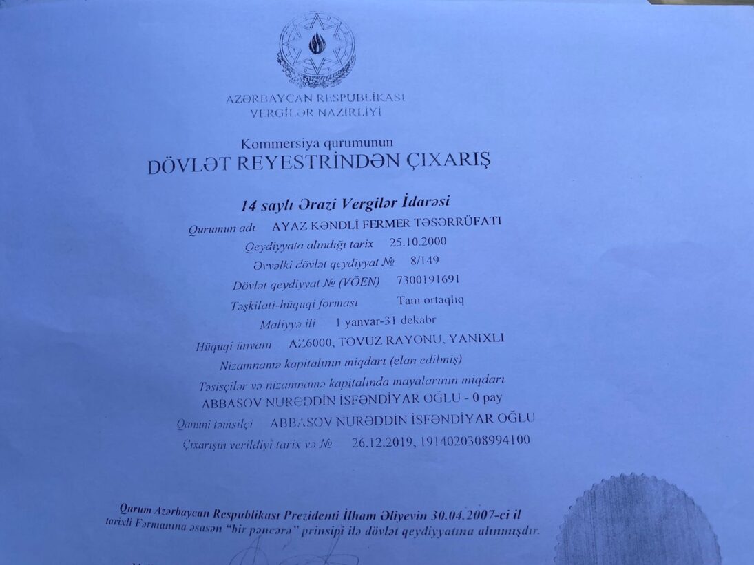 67 yaşlı Nurəddin Abbasov Meydan TV-yə danışır ki, 1995-ci ildə kəndli-fermer təsərrüfatı yaradıb, əkinçiliklə məşğul olmaq üçün Dövlət Fondundan 8 hektar torpaq sahəsi alıb.
