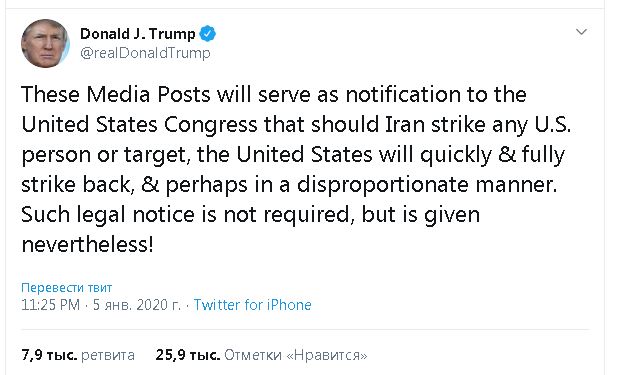 "İran ABŞ-ın hər hansı bir şəxsinə, yaxud hədəfinə zərbə vuracağı təqdirdə Birləşmiş Ştatlar dərhal və tam qüvvə ilə qeyri proporsional cavab zərbəsi endirəcək. Bunun üçün rəsmi bildiriş tələb olunmur, amma hər halda təqdim olunur”.