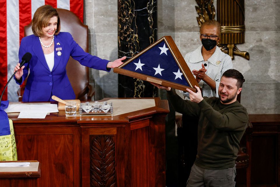 Çıxışının sonunda Zelenski vitse-prezident Kamala Harrisə və Nümayəndələr Palatasının spikeri Nensi Pelosiyə çevrilərək onlara bir gün əvvəl cəbhə xəttində rastlaşdığı əsgərlərin imzaladığı Ukrayna bayrağını verib.
